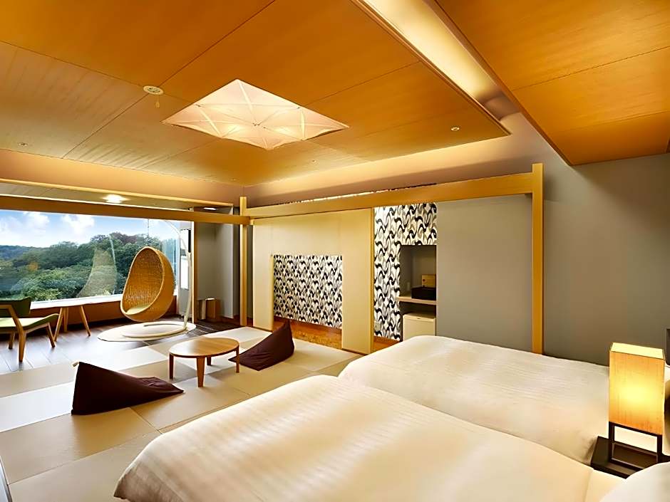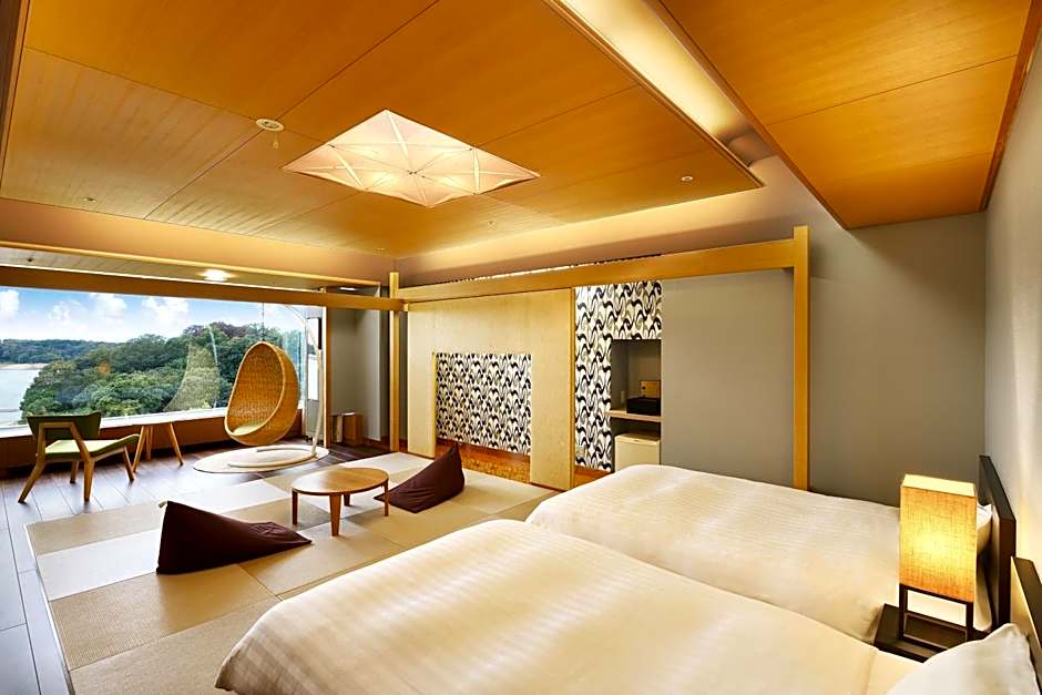 The twin room includes a private bathroom, well-fitted with a bath, a shower, a bidet, a hairdryer and slippers. The spacious air-conditioned twin room offers a flat-screen TV with satellite channels, tatami, a tea and coffee maker, a safe deposit box as well as lake views. The unit has 2 beds and 3 futons.